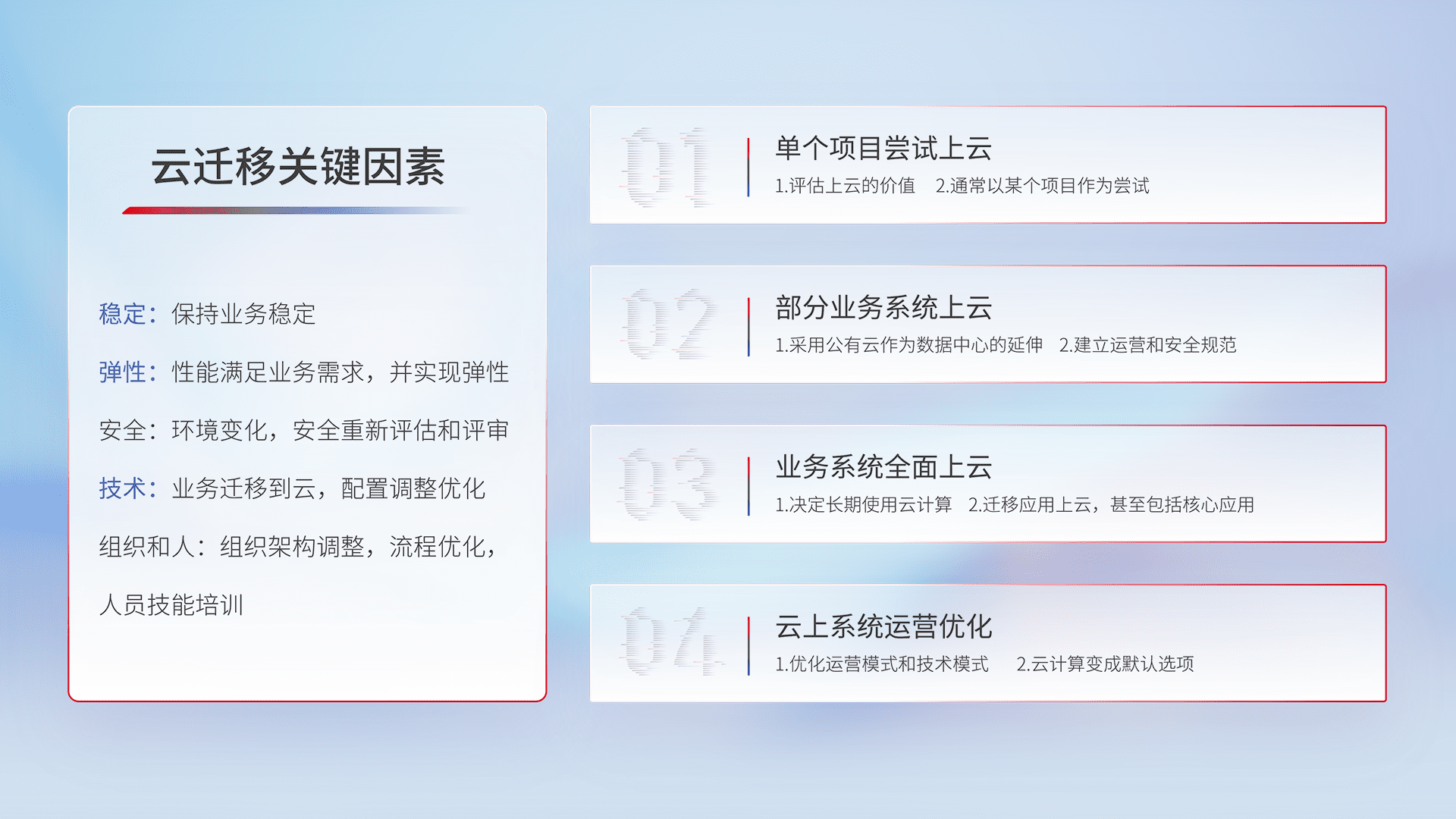 结合实际业务,,,从规划设计、、、云平台选型、、、、云原生改造、、、、数据迁移、、集成交付,,迁移全过程为客户识别最佳上云路径,,,,做好风险识别管理,,,设计网络架构、、、、身份权限、、安全审计合规、、操作审计、、、日志审计、、监控告警策略、、、多站点容灾设计等,,,对云上基础设施进行整体规划,,,提升IT治理水平,,,以满足弹性、、、、高可用、、高性能的需求。。。。
