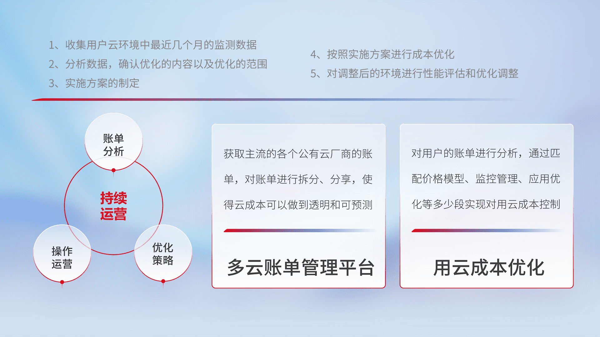 通过灵活运用多种自动化迁移工具,,,帮助企业用户实现业务和数据高效 、、、稳定的上云迁移和云上迁移,,,采用自研多云纳管平台,,以中立管理模式,,解决多组织、、、多云、、、、多运维厂商的复杂关系的管理,,,保证多云平台资源配置的一致性,,,,实时掌控云资源运行数据,,运用智能化工具分析云资源多云平台的管理服务,,,透明化管理成本支出,,,用云成本可预测、、用云费用可优化、、云资源配额有据可依。。。。