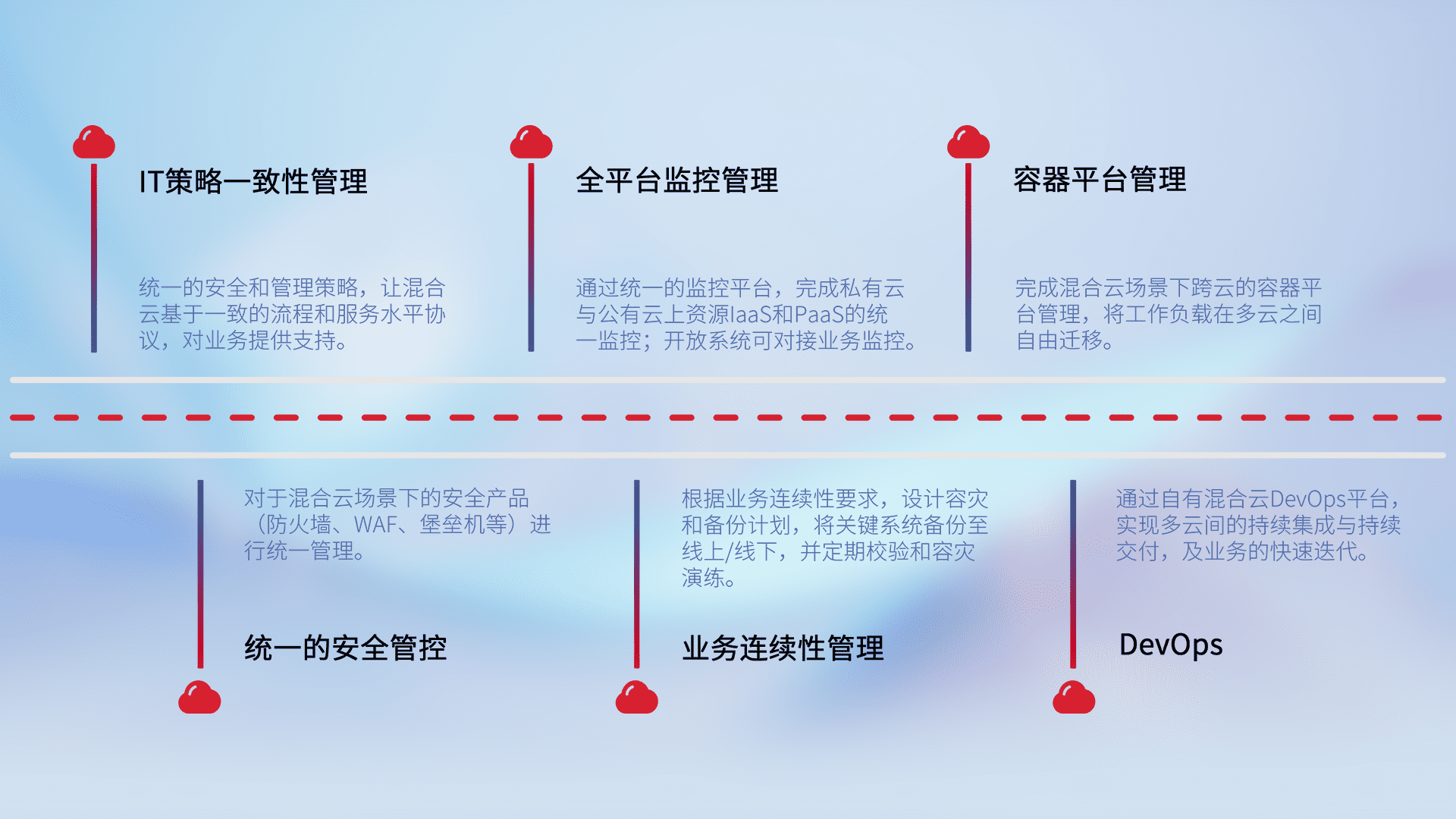 通过多云纳管,,,以统一的资源数据模型把客户的云资源进行抽象和封装,,,进而实现对多云资源的统一操作,,保障云资源管理的可靠性、、稳定性与可用性。。。。量身定制化运维内容,,,配置、、、、开发运维、、补丁管理、、、、备份、、监控、、、、认证和访问管理、、、审计和日常巡检等,,,,保障在用云过程中的可靠度,,,稳定度以及高可用率。。