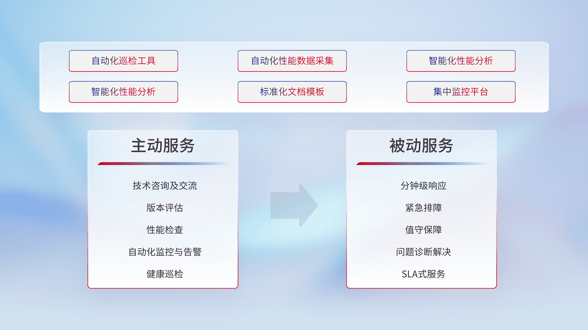 智能化工具和标准化文档,,,保障服务质量,,,提供主动服务(包含技术咨询、、、版本评估、、、性能检查、、自动化监控与告警、、、、健康巡检)和被动服务包含(分钟级响应、、紧急排障、、、值守保障、、、、问题诊断解决、、、SLA服务)。。。